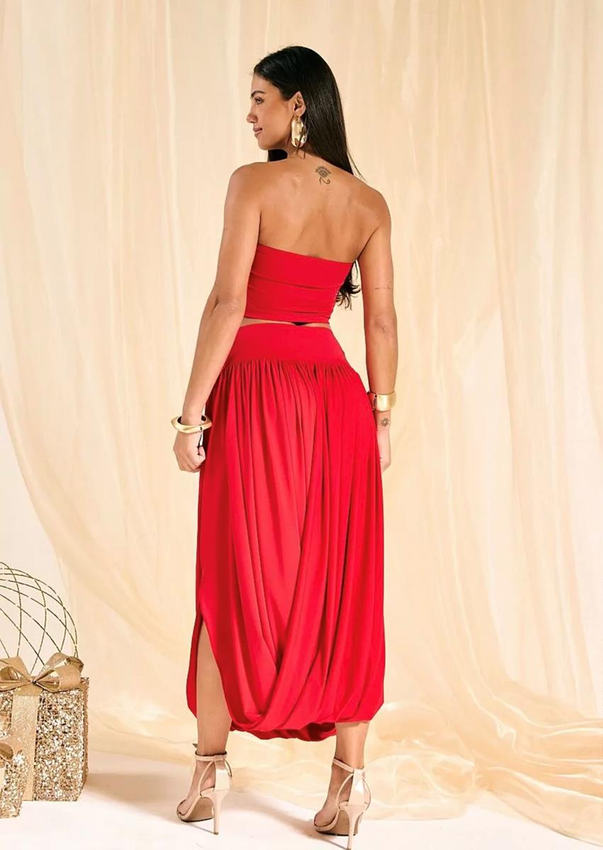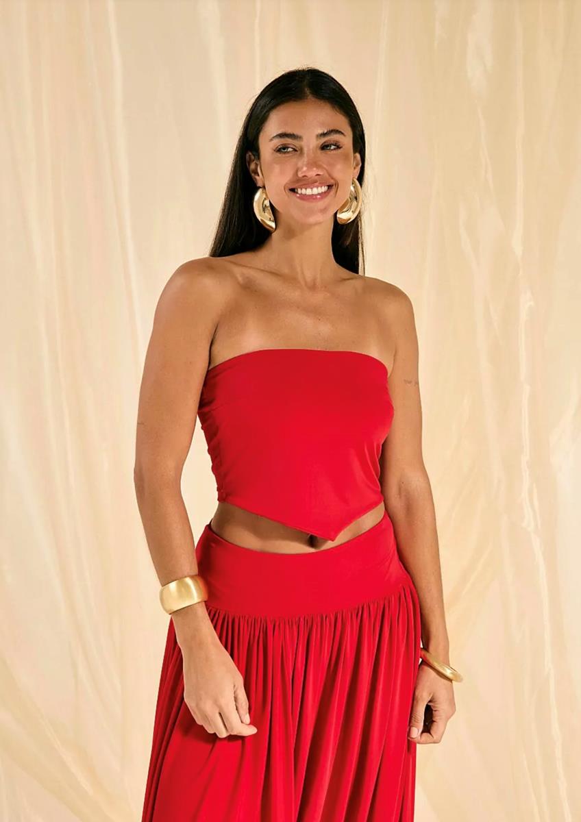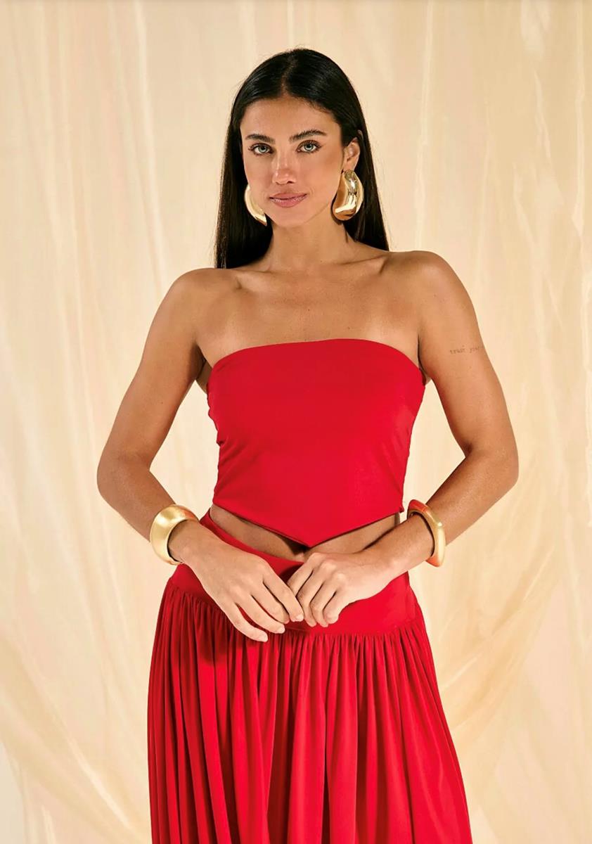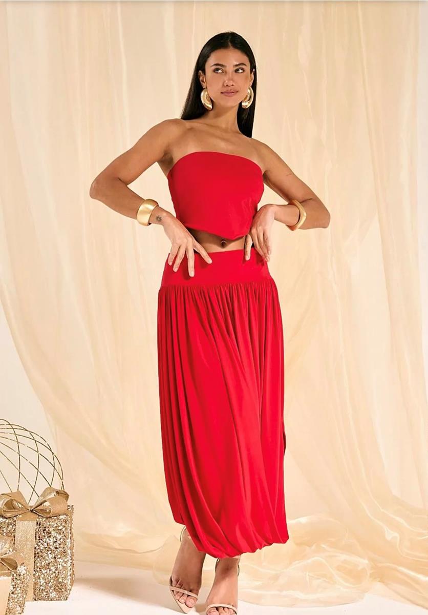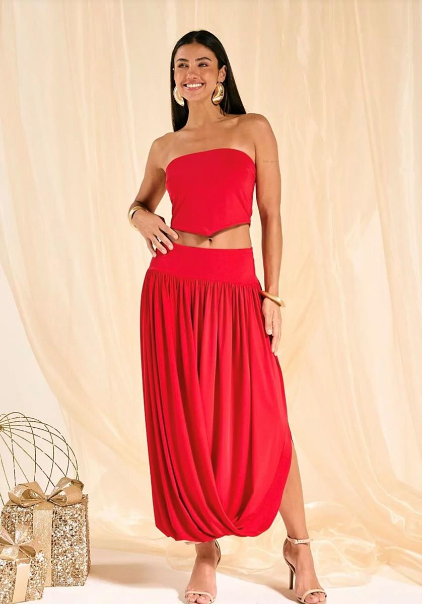 Conjunto em malha jersey composto por saia de efeito aladim, cós duplo. Cropped colo livre.
