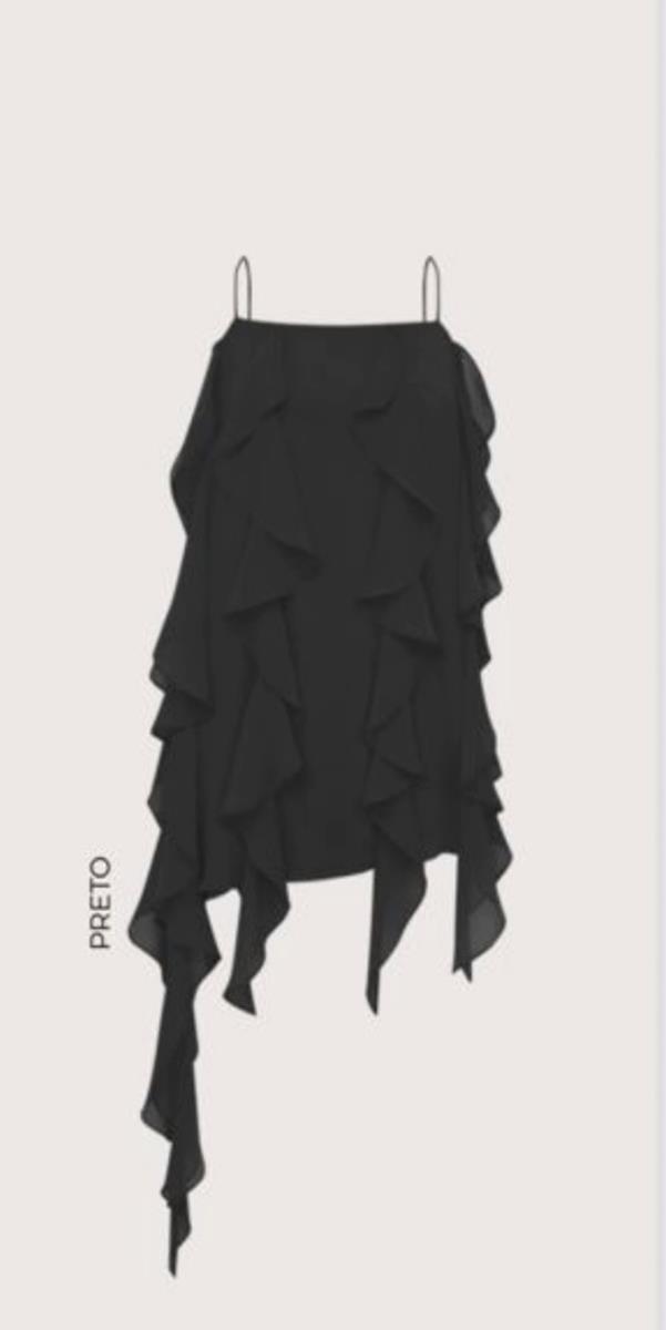 Vestido em chiffon com babados cascata com regulagem das alças e amarração nas costas