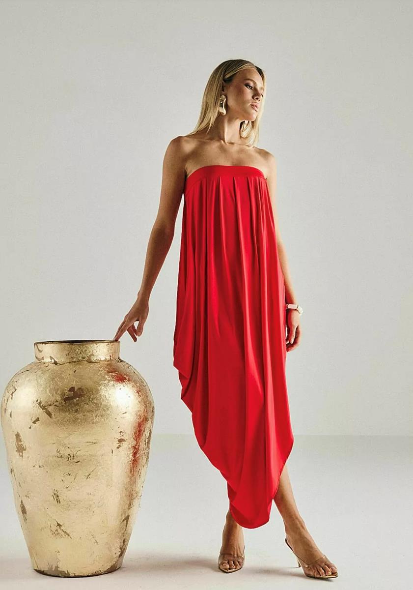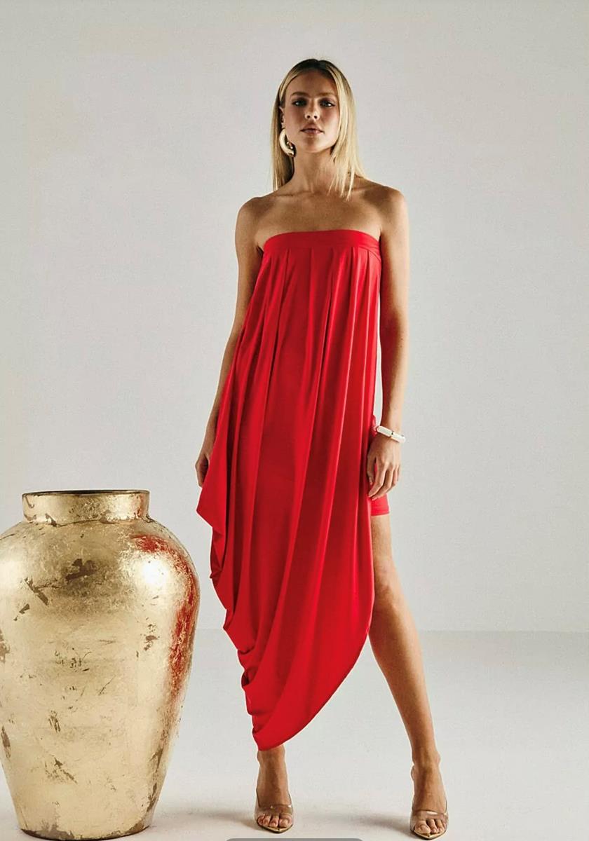 Vestido tomara que caia torcido em jersey com tubinho por baixo