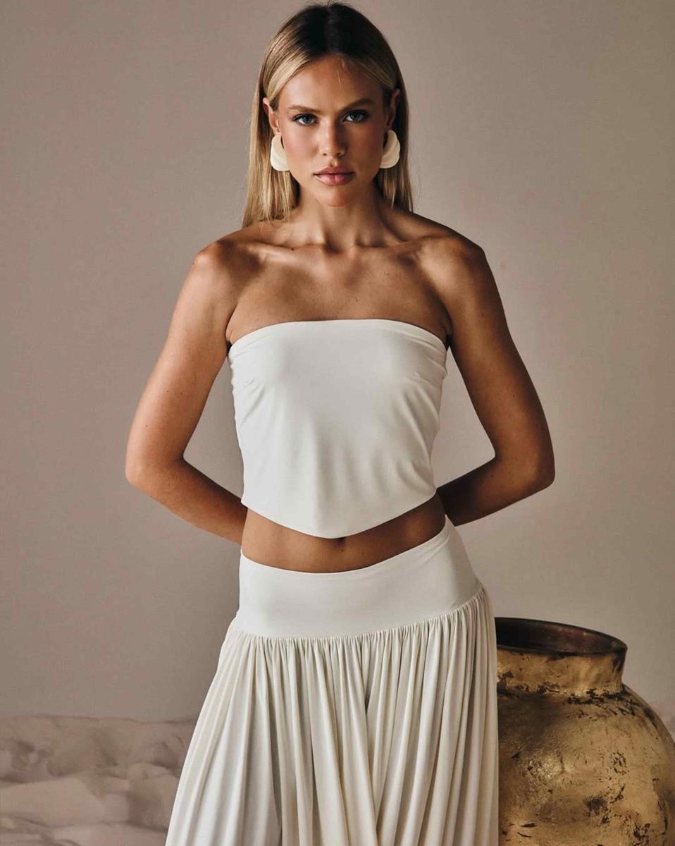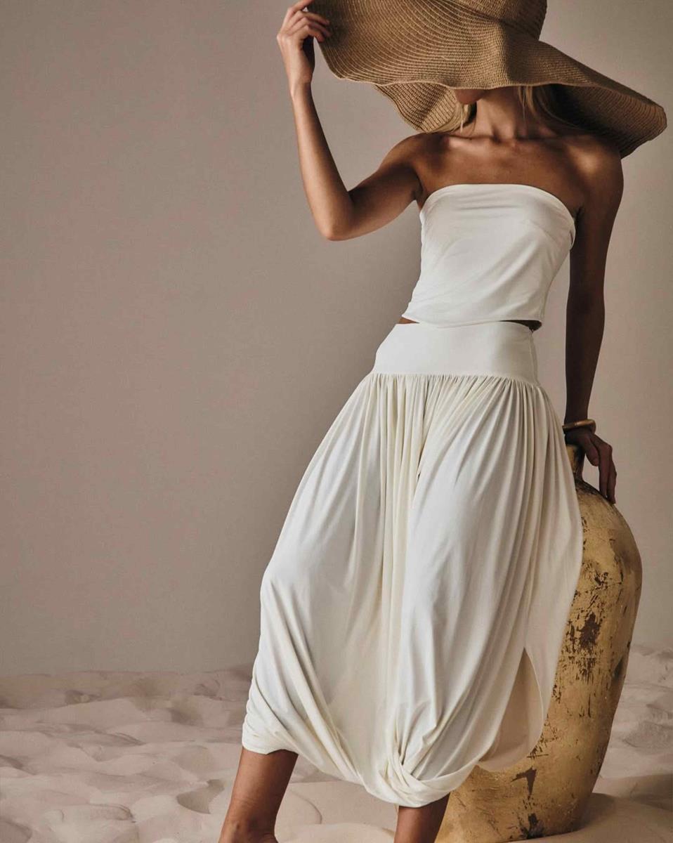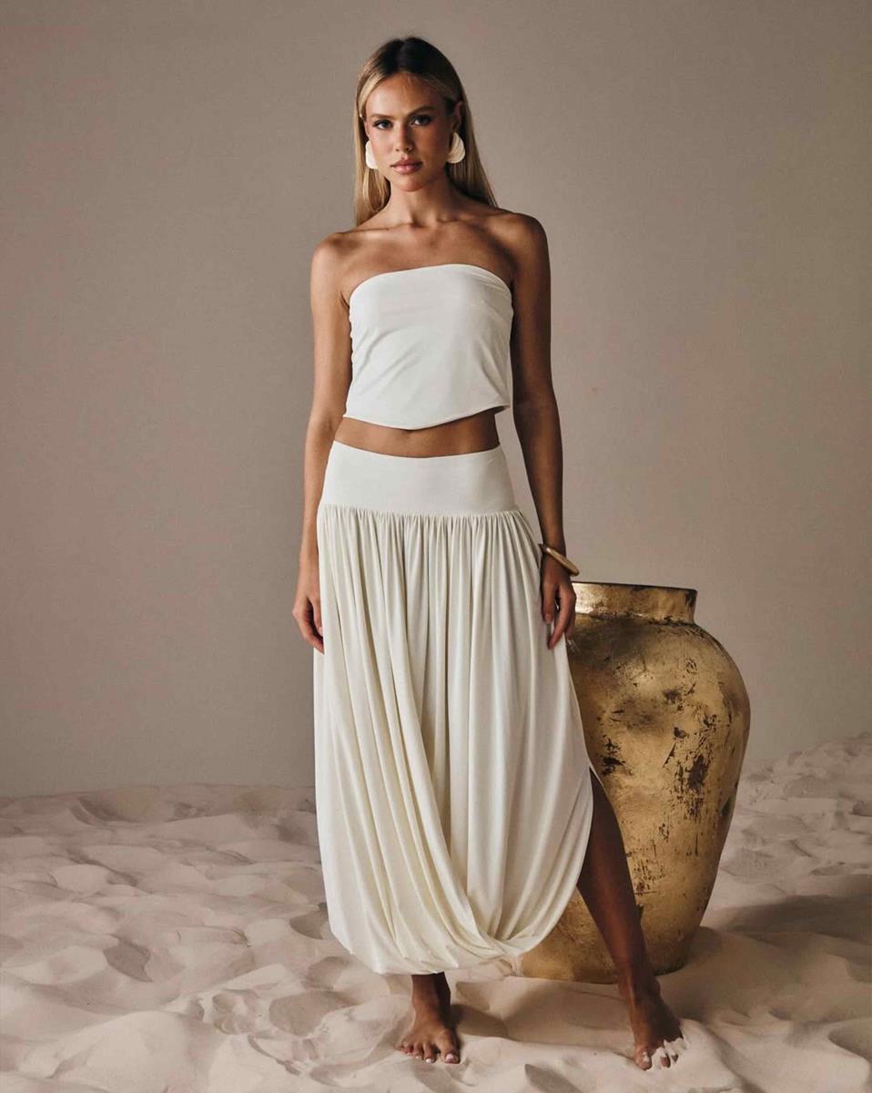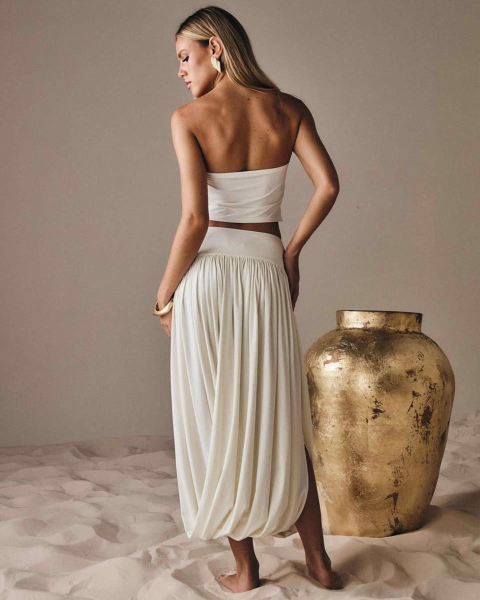 Conjunto em malha jersey composto por saia de efeito aladim, cós duplo. Cropped colo livre.